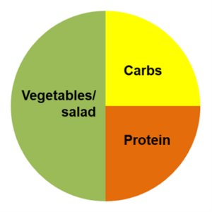 - To the one quarter plate of carbohydrates, add a one quarter plate of protein (chicken, meat, fish, eggs, vegetarian alternatives, cheese, and beans) and a half plate of vegetables/salad.