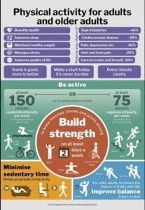- For older adults, to reduce the chance of frailty and falls, do activities to improve balance on two days per week, e.g. bowls, Tai Chi or dance.