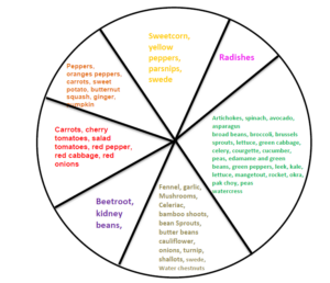 - It is advised to choose a wide variety of different vegetables of different colours to get different nutrients and support a healthy digestive system.