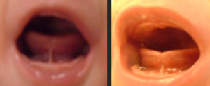 When the tongue-tie has been cut, it can open into a diamond shape at the base of the tongue. This seals over quickly and then becomes a white patch which looks a bit like an ulcer. This gradually gets smaller and heals over a period of one to two weeks. If your baby is jaundiced, it can be yellow.
